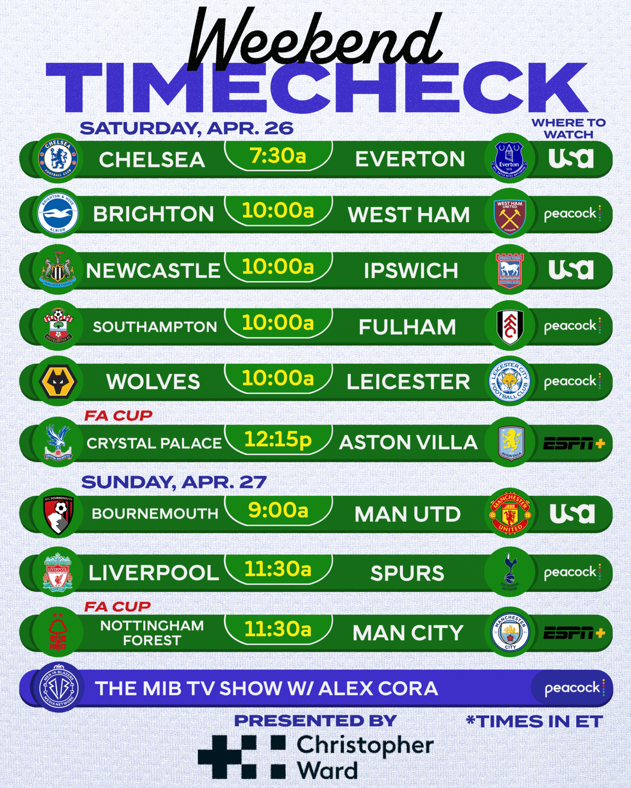 And: 🎥 THE MEN IN BLAZERS TV SHOW, featuring the quite brilliant Red Sox manager Alex Cora, Liverpool obsessive and my second favorite member of the Cora family, is available this Sunday on Peacock. Alex Cora knows ball, and he knows Slot, Klopp, and Virg. Here is a taste. ⚾